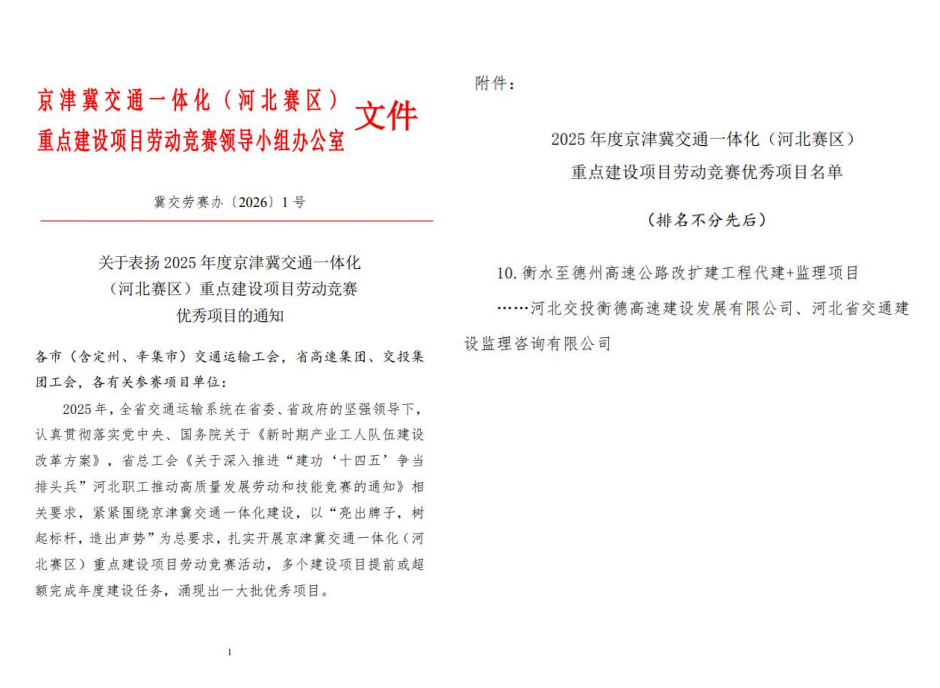 · 衡德高速公路改扩建“代建+监理”项目获京津冀交通一体化劳动竞赛优秀项目